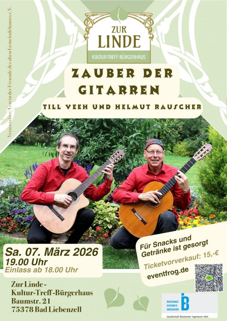 Zauber der Gitarren Till Veeh und Helmut Rauscher Sa. 07.03.2026, 19 Uhr (Einlass ab 18 Uhr)Ticketvorverkauf 15 Euro Eine Veranstaltung…