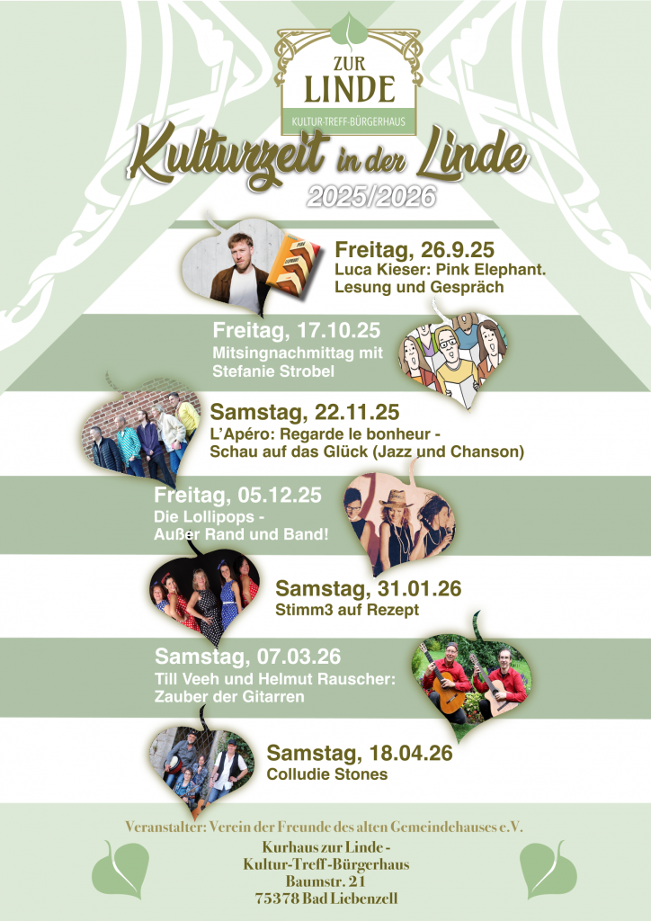 Kulturzeit in der Linde 2025/26 Kulturprogramm im Herbst 2025 und Frühjahr 2026Veranstalter: Verein der Freunde des alten Gemeindehauses e.V. Veranstaltungsort: Kultur-Treff-Bürgerhaus „Zur Linde“, Baumstraße 21, 75378 Bad Liebenzell Wir freuen uns über Ihren Besuch!